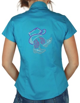 This shirt is a "Must Have" in our country music collection ! The rhinestone design on the back is perfect on the line dance floor