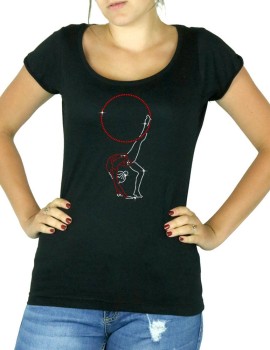 100% cotton women's t-shirt with a pretty feminine neckline. This top is decorated with a rhinestone graphic, the design here represents a GR rhythmic gymnastics apparatus: the hoop.