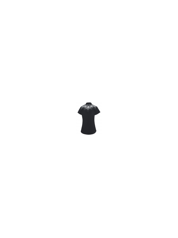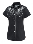 Beautiful short-sleeved western blouse with elegant embroidery on the chest and back. With two-colored piping and unusual square snap buttons.