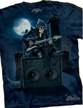 Tee-shirt américain, impression d'un squelette jouant de la guitare sur un ampli devant sur fond tie-dye ou marbré.