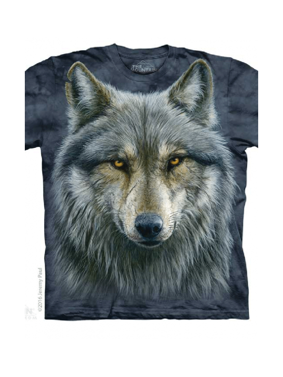 Tee-shirt américain, impression d'un motif tête de loup sur fond tie-dye ou marbré.
