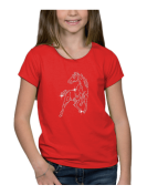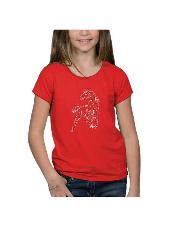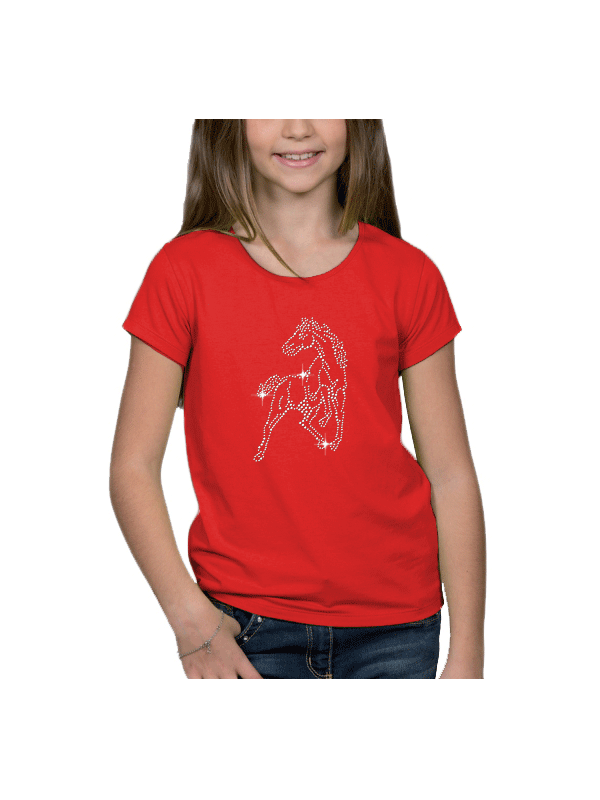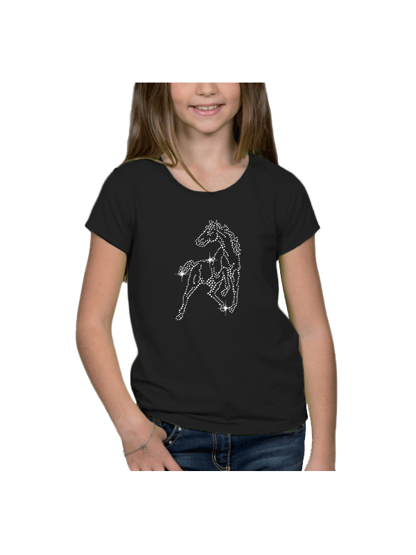 Tee-shirt fillette moulant col rond. Un cheval en clous est imprimé sur le devant du t-shirt