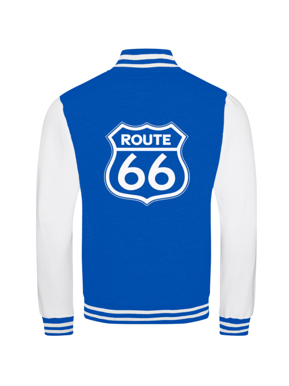 Jacket varsity teddy white sleeves. Get the perfect american look with this varsity jacket and the jacket is printed with the Route 66 symbol