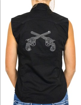 Le motif dans le dos représente deux revolvers qui se croisent, et devant une botte de chaque côté. Chemise disponible de la taille S au 4XL Deux couleurs disponibles: Noir, Blanc.